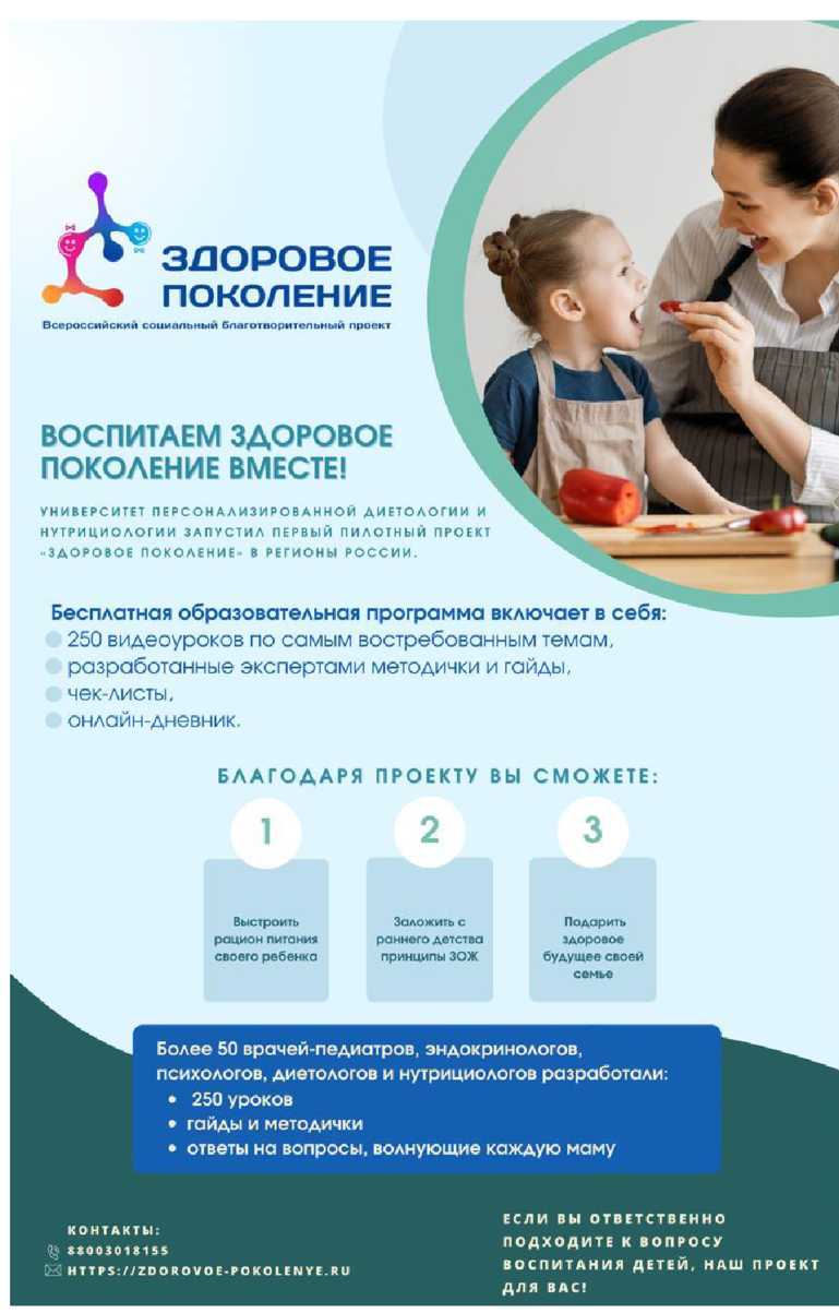В настоящий период времени готов к запуску сайт https://zdorovoe-pokolenye.ru, содержащий образовательную программу из 250 уроков для молодых матерей, воспитывающих детей и стремящихся сформировать основу для их здорового будущего. Также в разработке находится специализированное приложение для родителей тех, кто готовится ими стать, призванное дать еще более широкий спектр возможностей в части использования и практического применения. Данная программа будет реализовываться бесплатно для граждан Российской Федерации.