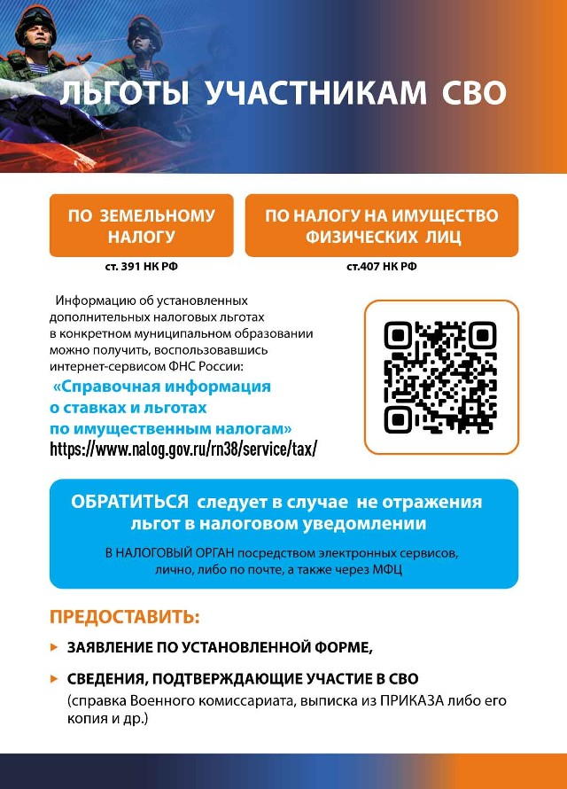 Если вы или ваш близкий являетесь участником СВО, вы имеете право на федеральные льготы по земельному налогу и налогу на имущество (ст. 391 и 407 НК РФ).