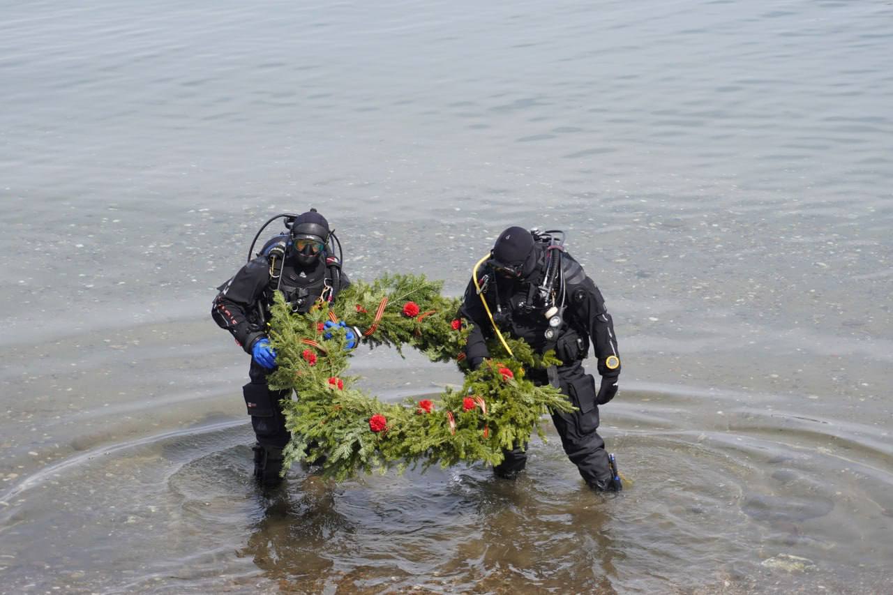Вчера у мемориала собрались юнармейцы школы №2 и лицея №11, глава города Слюдянки Андрей Владимирович Должиков, председатель Думы Слюдянского МО Михаил Михайлович Кайсаров, депутаты Думы Слюдянки и Слюдянского района, водолазы ПСЧ-52, среди которых – депутат городской Думы Николай Пинчук, имеющий более 20 лет опыта. Были возложены цветы, спущен на воду венок, прозвучала минута молчания.