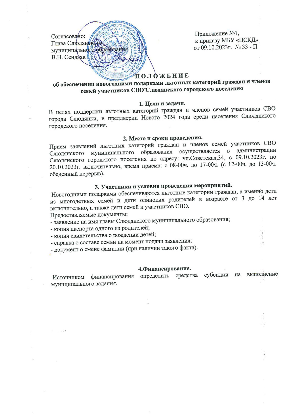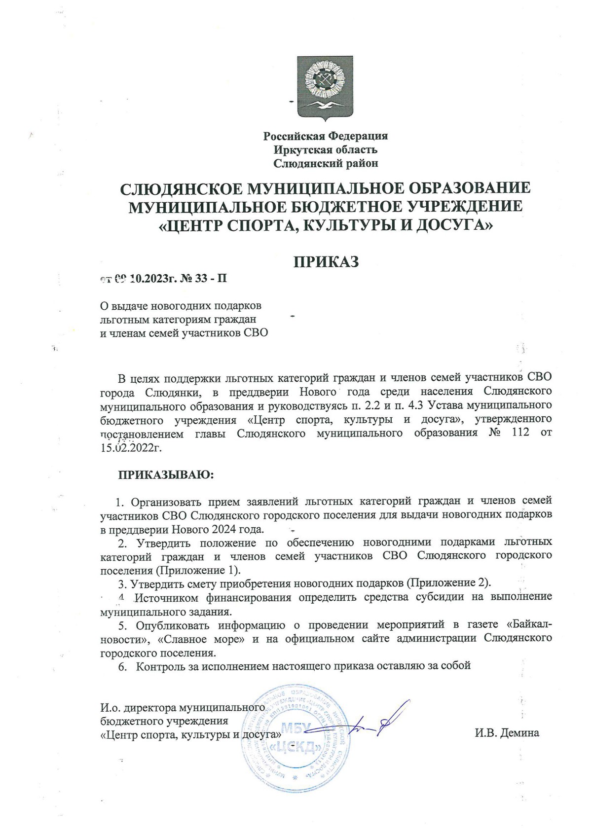 Приказ от 09.10.2023г. № 33-П "О выдаче новогодних подарков льготным категориям граждан и членам семей участников СВО