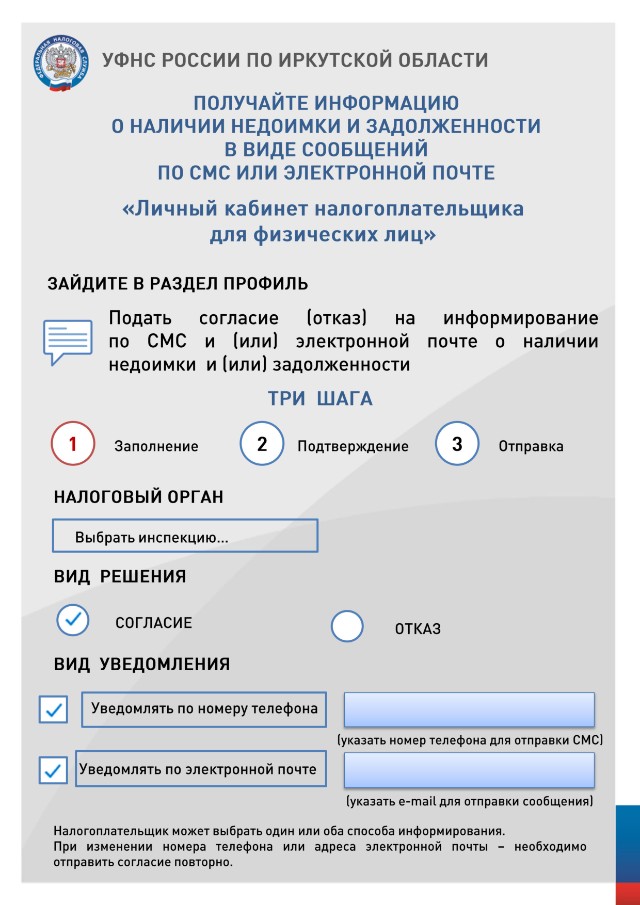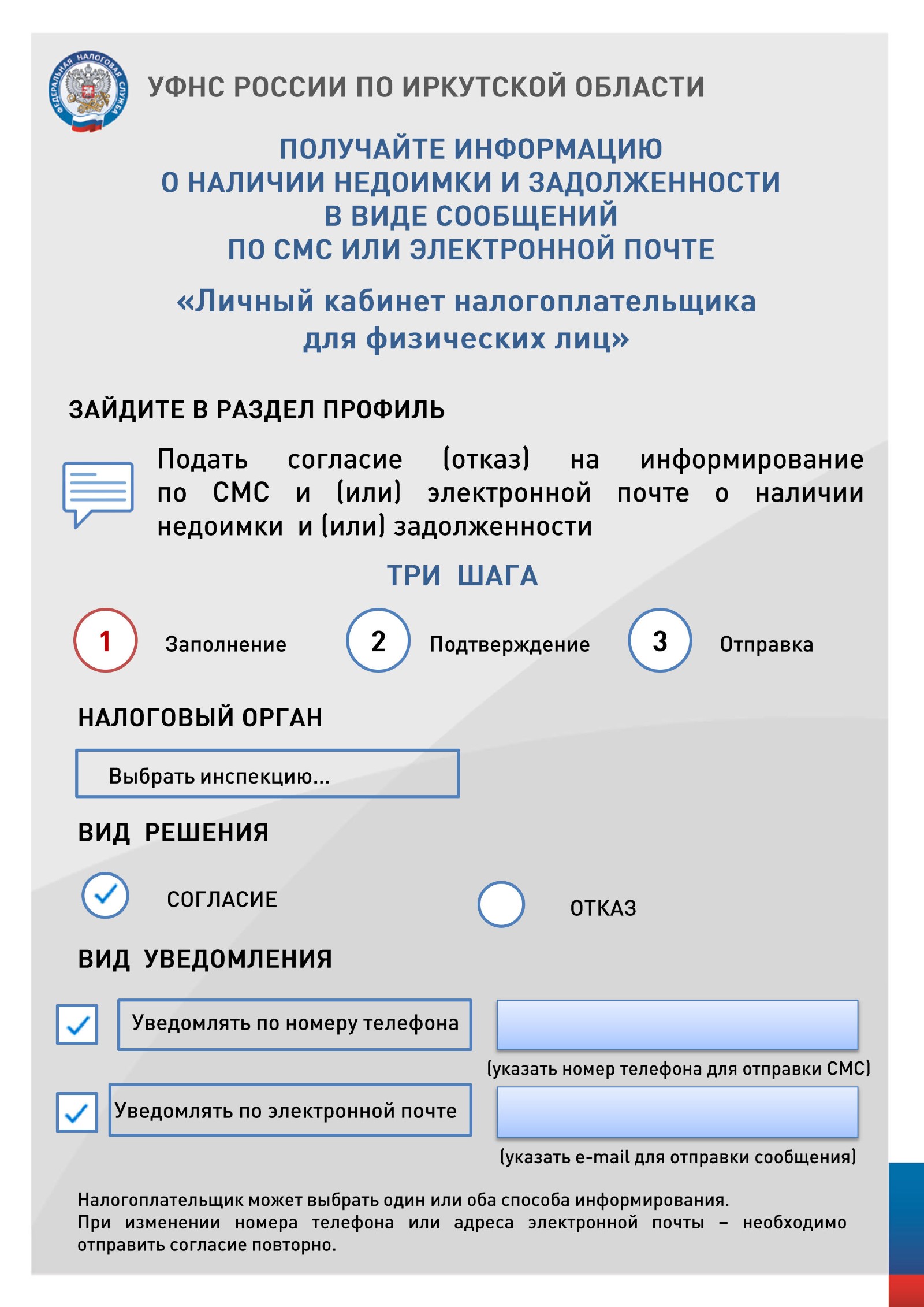 Налогоплательщики (плательщики сборов, страховых взносов и налоговые агенты), представив в инспекцию согласие на информирование о наличии у них недоимки (задолженности) по налогам, пеням, штрафам и процентам, могут получать оповещения в виде смс-сообщений на указанный ими телефон или на адрес электронной почты.