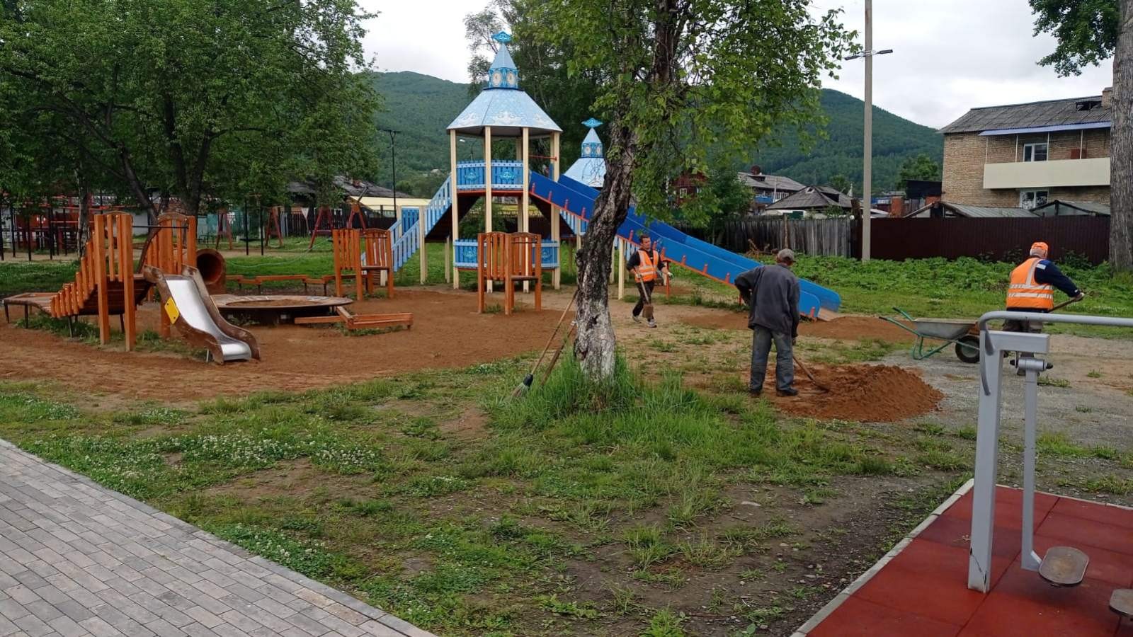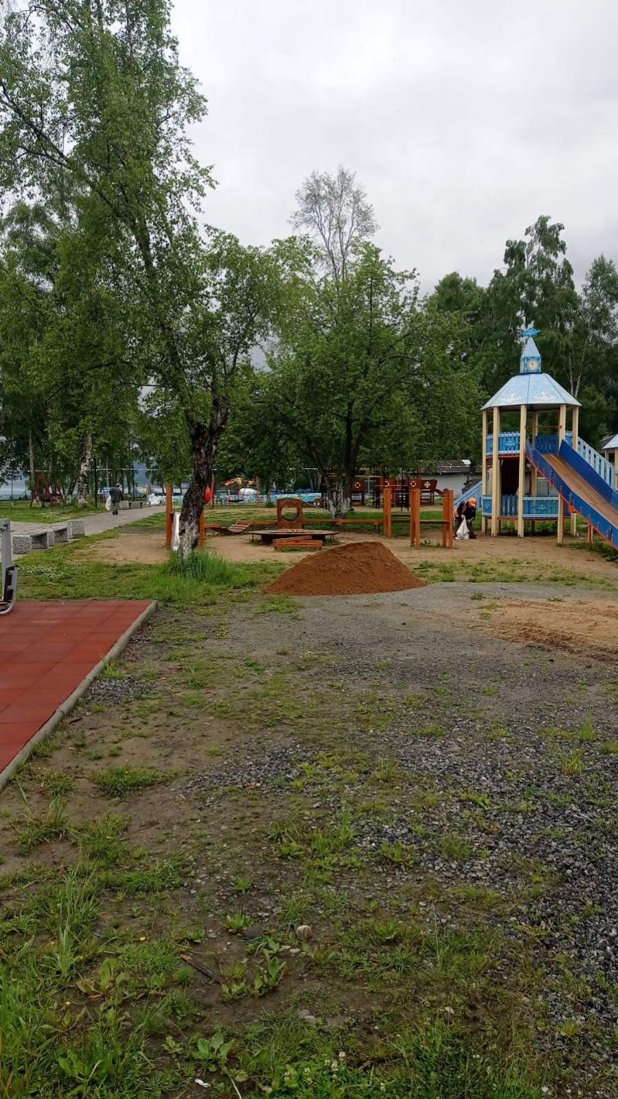Уборка мусора ,отсыпка песком детской площадки (п.Железнодорожник),ремонт качели ул.Ленина 115