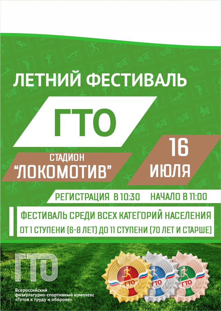 Приглашаем Вас принять участие в летнем фестивале ГТО среди всех категорий населения от 1 ступени 96-8 лет) до 11 супени ( 70 лет и старше).