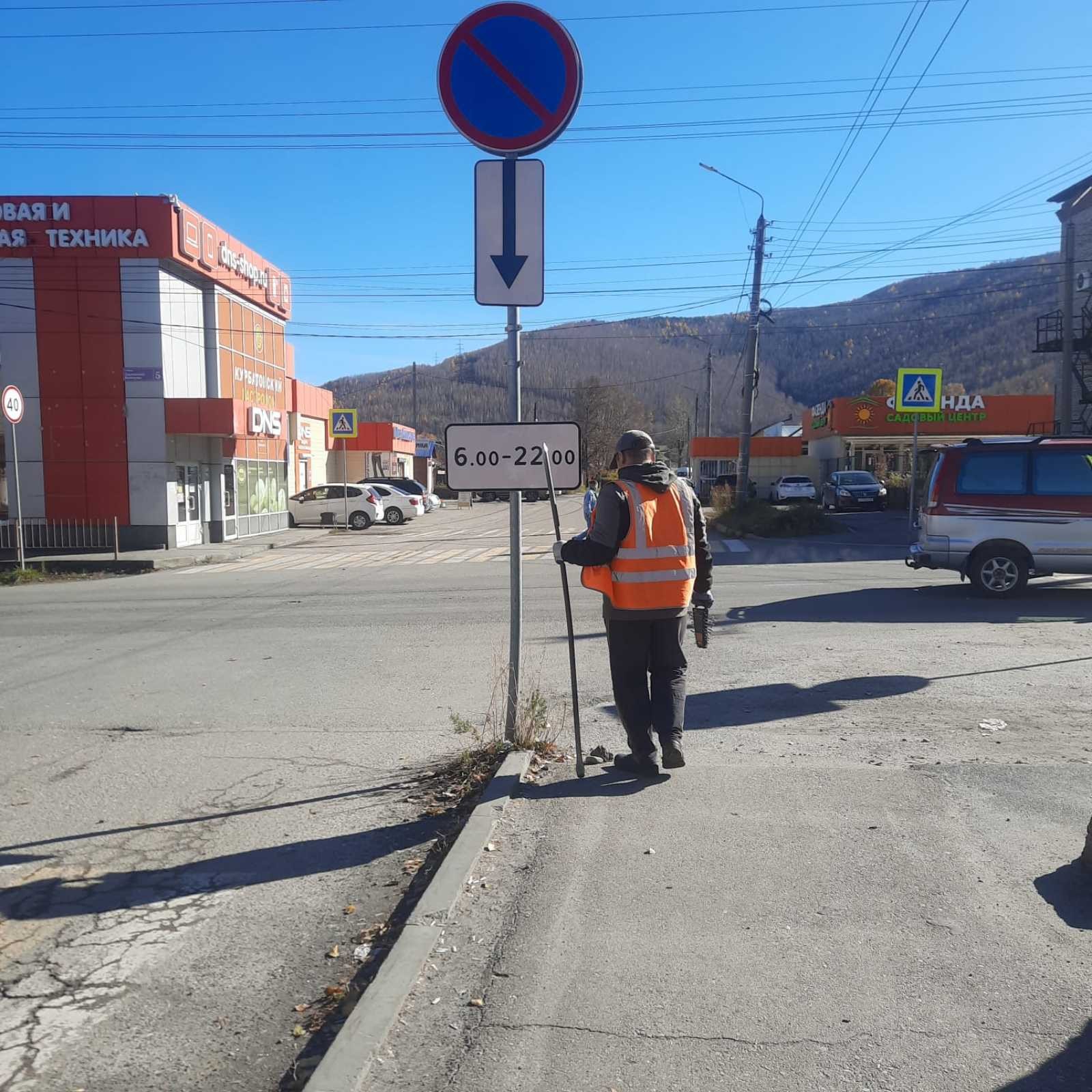 Уборка мусора по городу,поправили положение дорожного знака ...