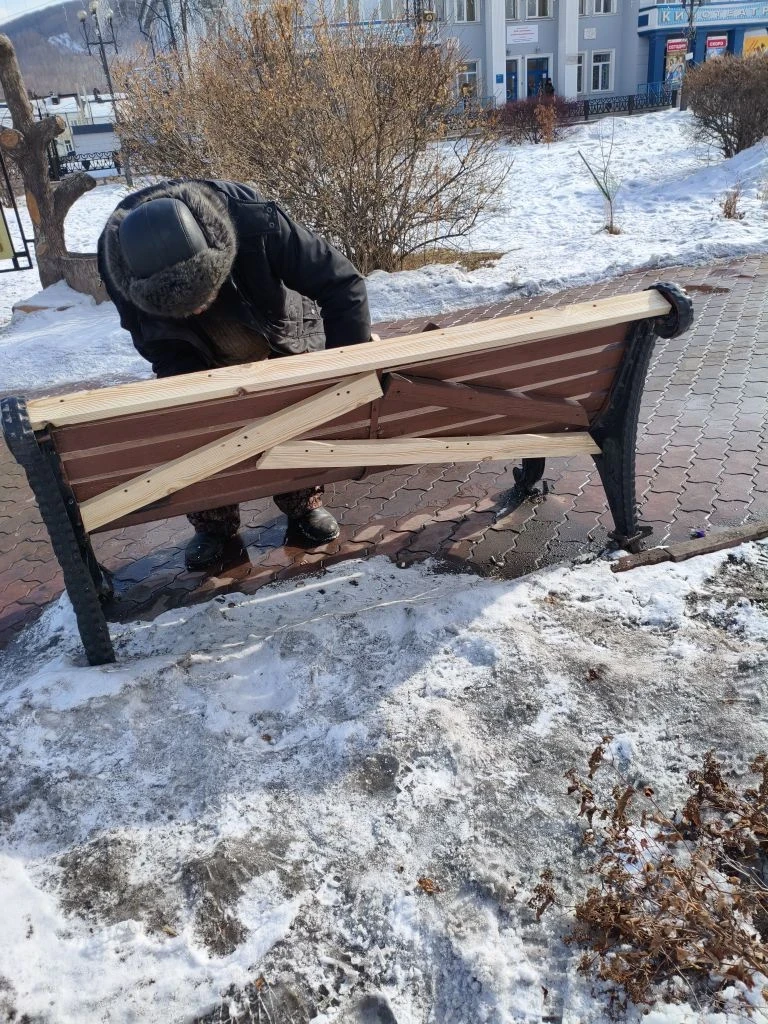 Чистка,уборка снега.Ремонт лавочки (ц.сквер).