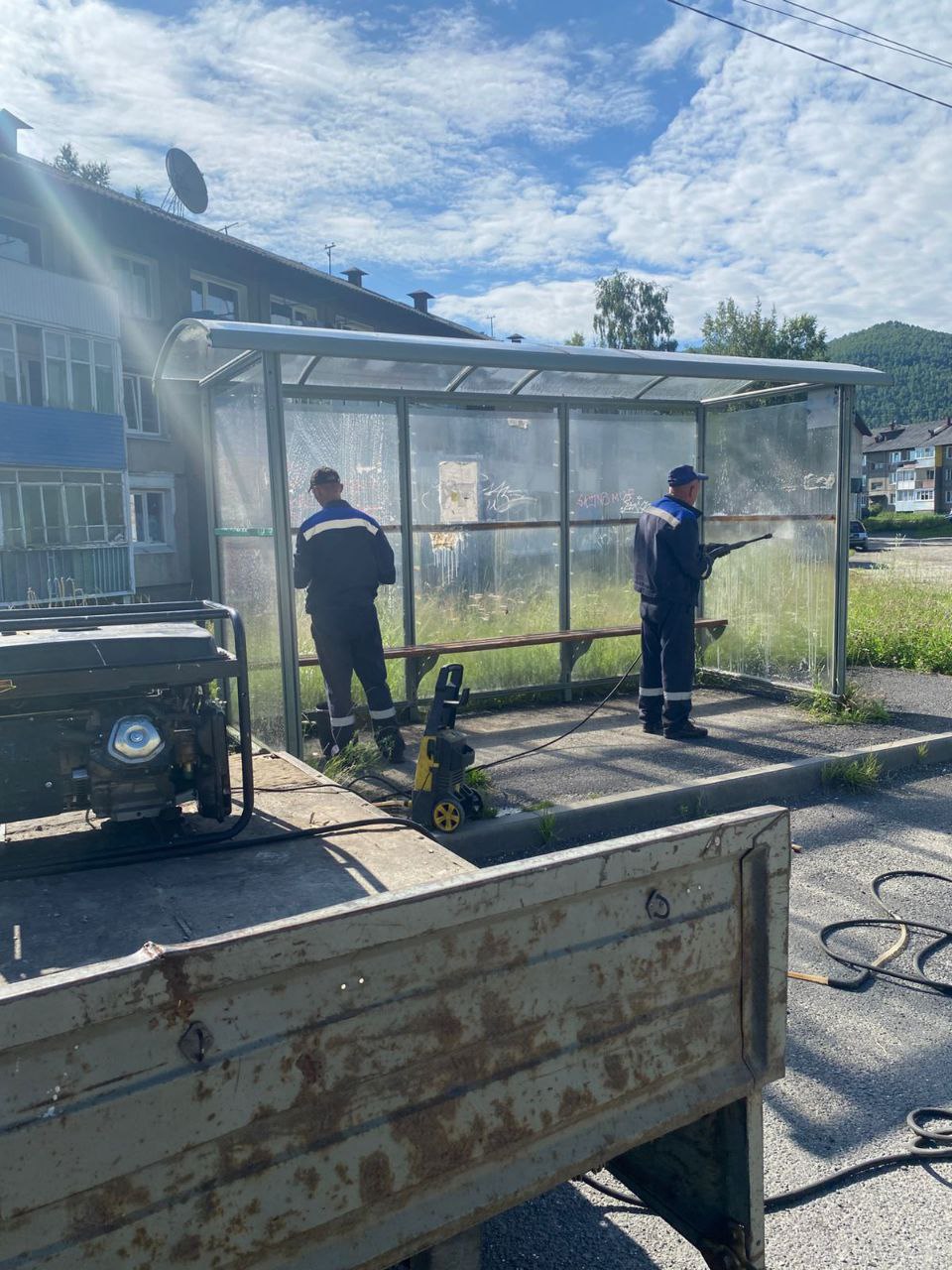 Косьба растительности,устройство нового оборудования на ДП (ул.Строителей,ул.Шахтёрская,ул.Гранитная),планировка дорожного полотна (ул.Ленина),продолжаем мойку остановочных пунктов.