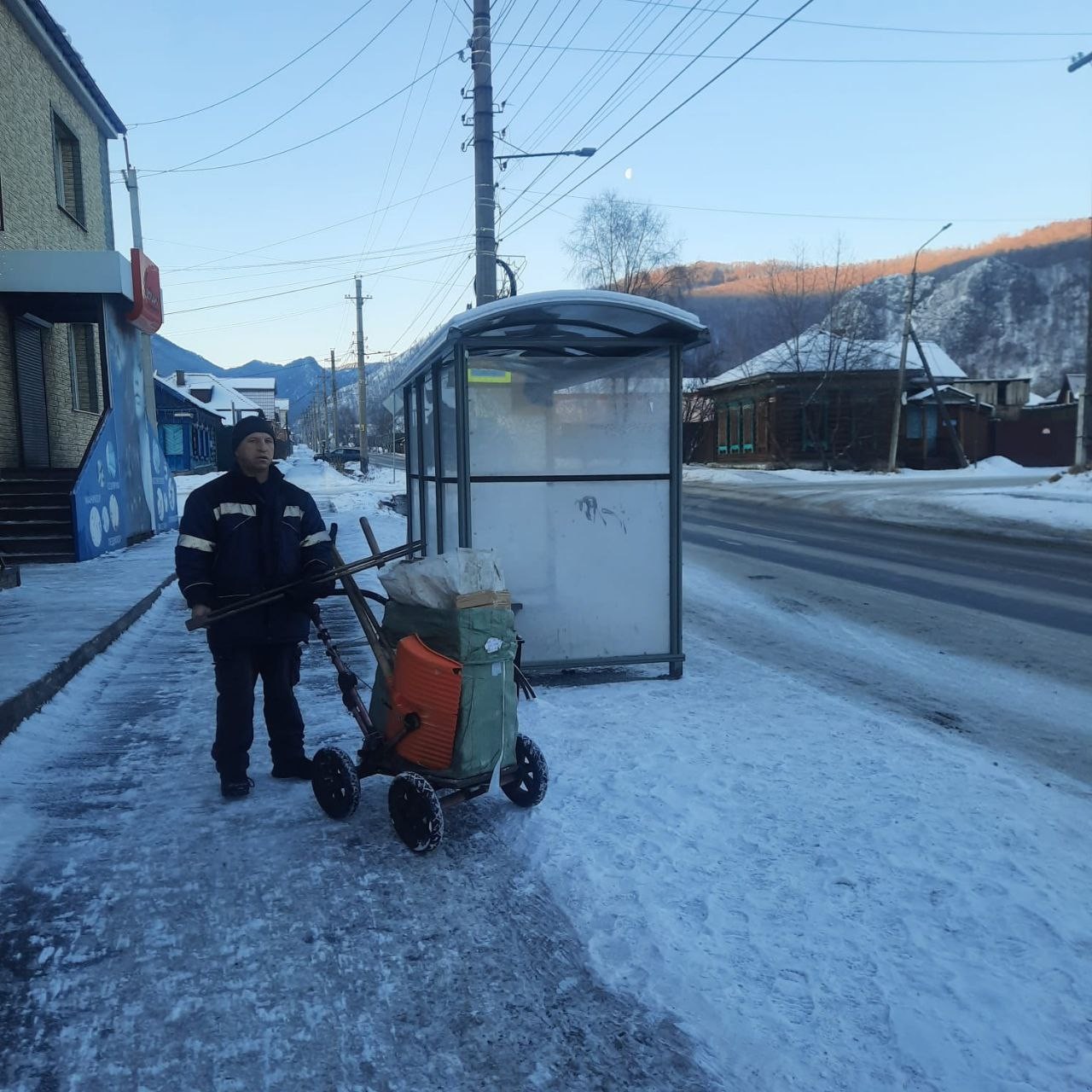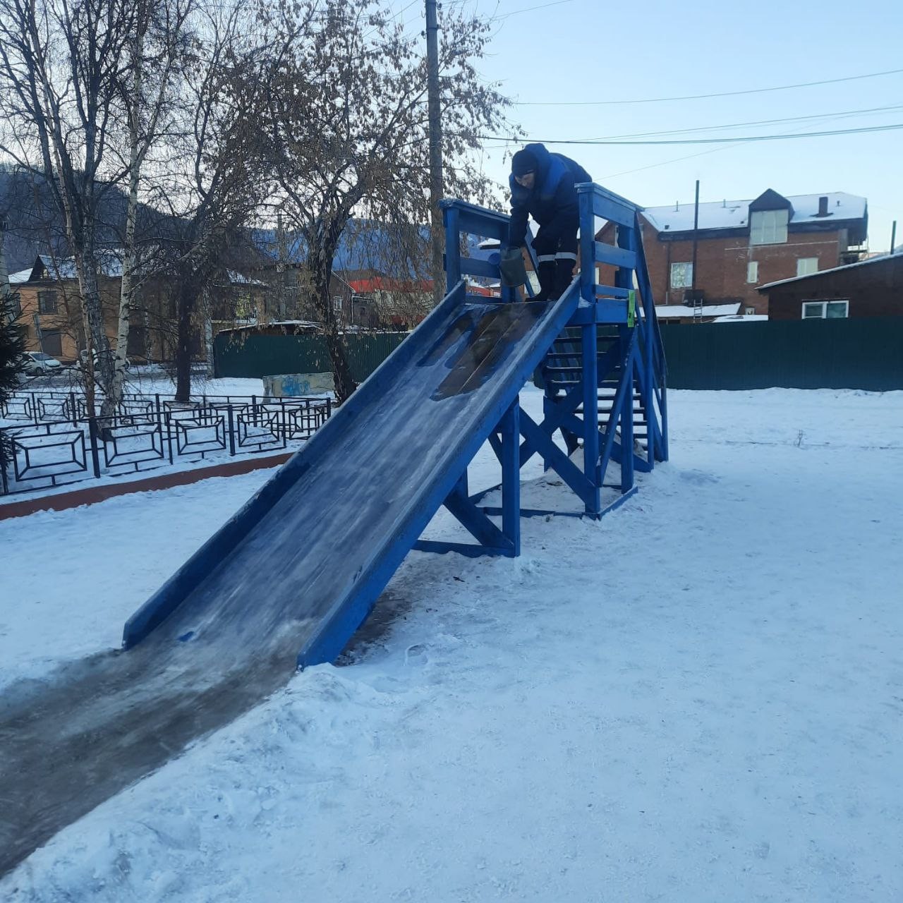 Уборка остановочных пунктов,чистка катка (ст.Перевал),заливаем горку (ц.площадь),разместили памятные таблички(п.Перевал).