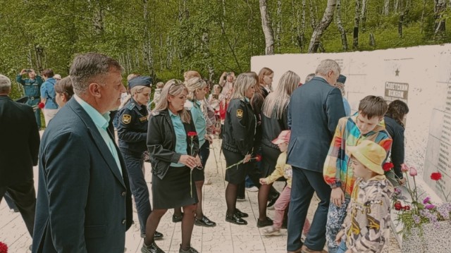 Присутствующие почтили память погибших в годы войны минутой молчания и возложили цветы к мемориалу.