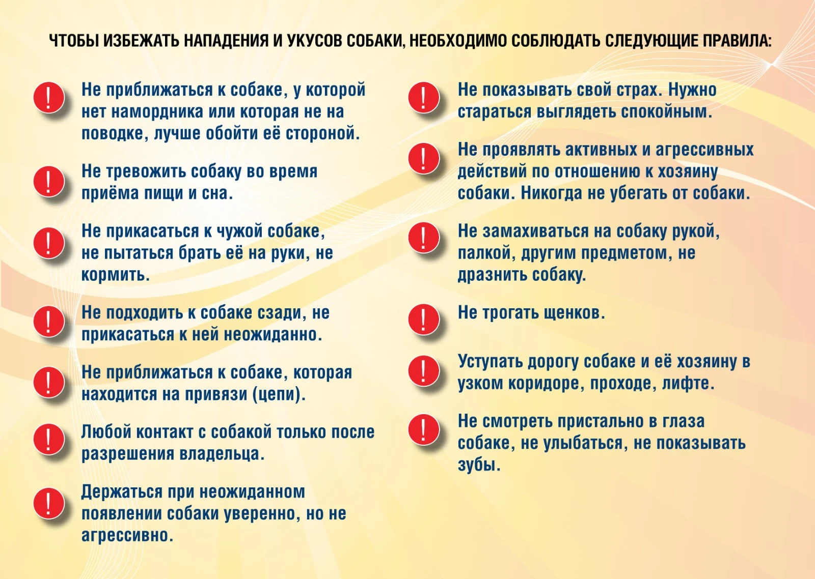 Находясь рядом с незнакомой собакой или стаей собак, ведите себя спокойно, не провоцируйте их на агрессию: не трогайте, не кричите, не размахивайте руками и не бегайте.