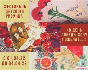 МБУ «Центр спорта, культуры и досуга» приглашает детей от 7 до 15 лет принять участие в фестивале рисунков поздравительных открыток «В День Победы хочу пожелать…», посвященному празднованию 77-летию Победы в Великой Отечественной войне.