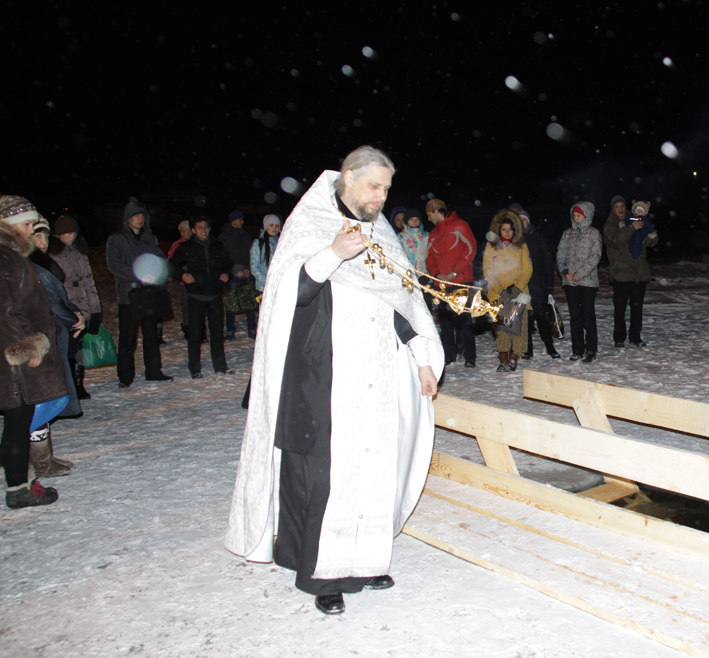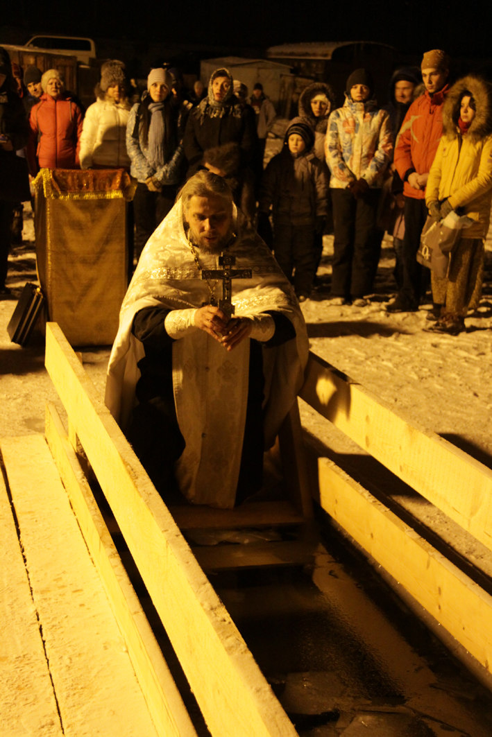 Батюшка Слюдянской Свято-Никольской церкви Олег вместе со своими помощниками начинает службу. Звучат молитвы и песнопения во славу Господа Иисуса Христа, прихожане читают Отче наш, батюшка с кадилом трижды обходит иордань. Затем служба продолжается чтением послания апостола Павла, святого евангелия, всеобщей молитвой.