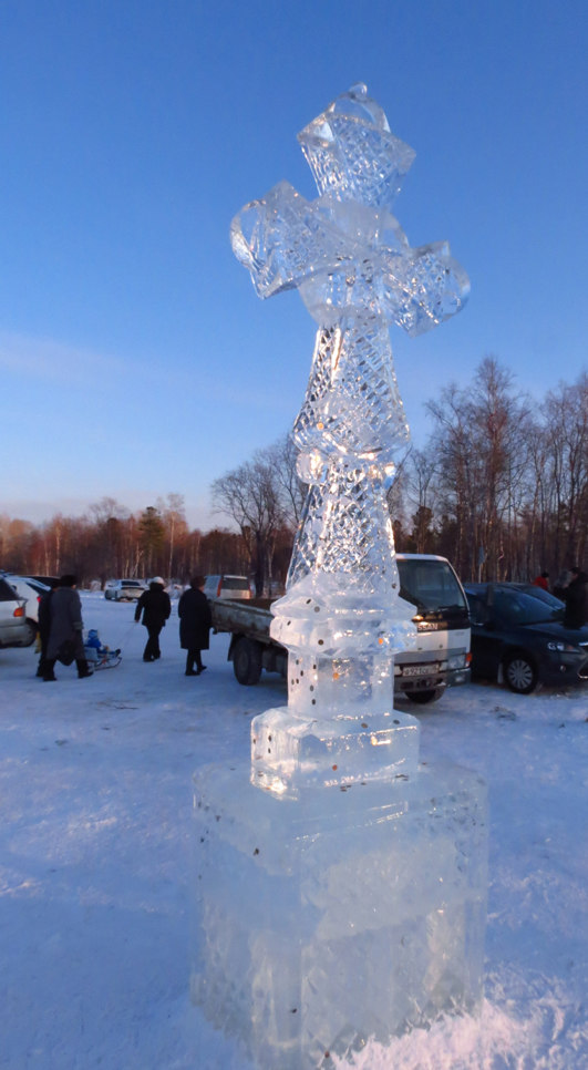 К 22 часам на льду в заливе все было готово для проведения православного праздника: прорубь (иордань) вырублена во льду, она оборудована деревянными перилами, ступеньками с обеих сторон. Выход к открытой воде (Байкал еще не замерз) перекрыт ограждением. Все отлично видно, потому как здесь, на льду залива лодочной станции, установлены два высоких надувных светильника, напоминающих своей формой свечи (официально она называется «Световая башня. Аварийная осветительная установка», из названия понятно, где она применяется).