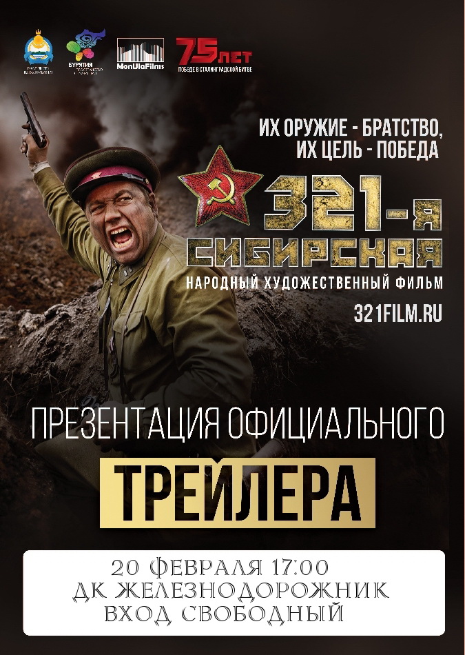 Презентация официального трейлера фильма "321-я сибирская" режиссера Солбона Лыгденова и команды киностудии "MonUla Films" о подвиге сибиряков, сражавшихся за нашу Родину на Сталинградском фронте в 1942-1943 г.г. состоится 20 февраля в 17:00 часов в ДК Железнодорожник. Вход свободный.