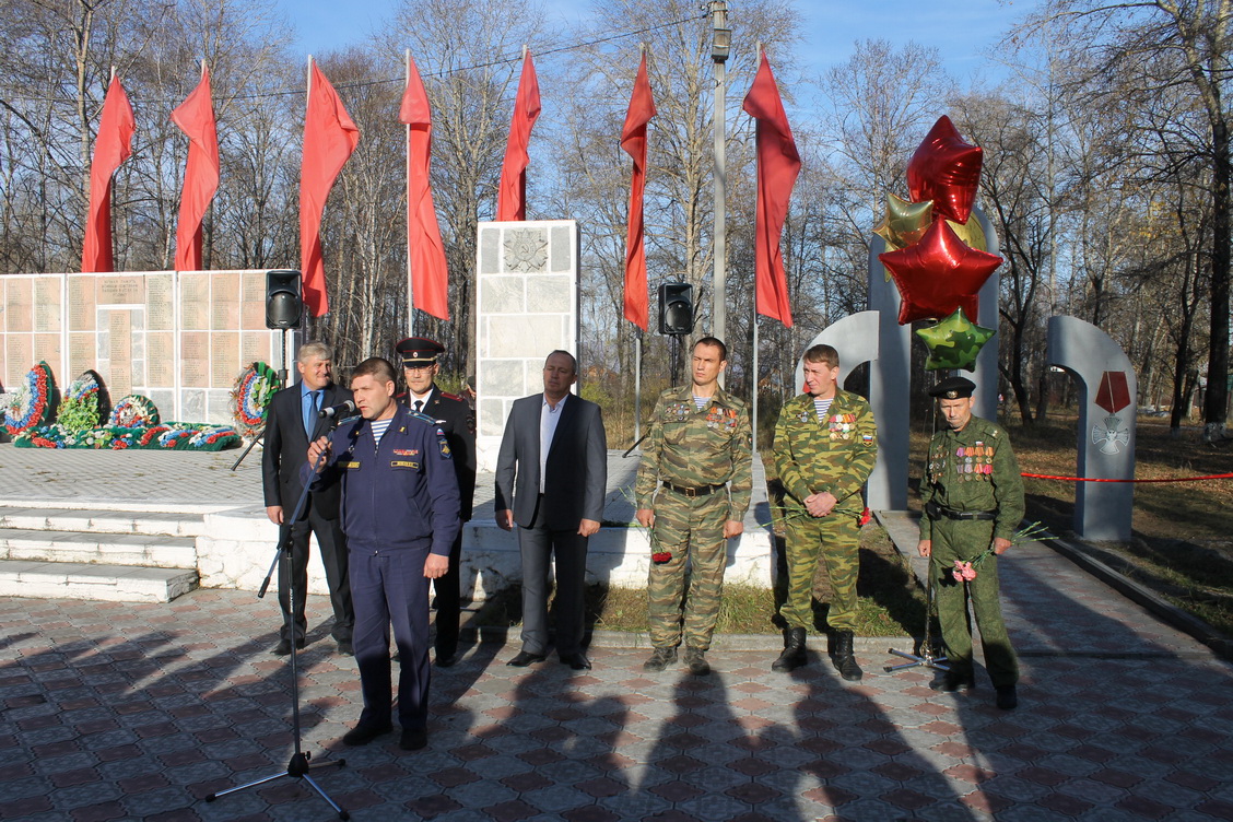 На открытии памятника выступили почетные гости – внештатный советник губернатора Иркутской области, председатель комитета Иркутской области общественной организации ветеранов и инвалидов боевых действий в Чечне и иных локальных конфликтов Игорь Петрович Зуев, председатель районной организации ветеранов и инвалидов боевых действий Чечни и иных локальных конфликтов Андрей Викторович Животягин, участник боевых действий, депутат Думы Слюдянского муниципального образования Александр Владимирович Плохотнюк, военный комиссар Слюдянского района Дмитрий Михайлович Шевелёв, начальник ОМВД России по Слюдянскому району Игорь Игоревич Борхолеев. Почётными гостями перерезана красная ленточка и залпы караула возвестили о минуте молчания в память о наших земляках.