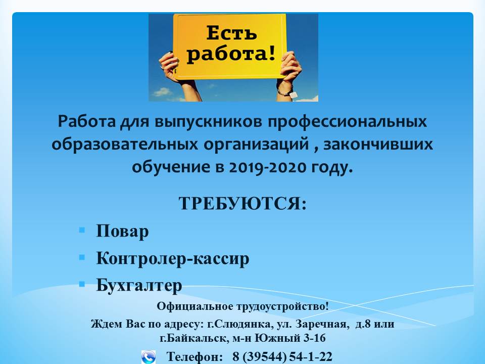 Есть работа для выпускников 2020г.-2021г. профессиональных образовательных организаций по профессиям: юрисконсульт делопроизводитель электрогазосварщик экономист слесарь по ремонту автомобилей и др....