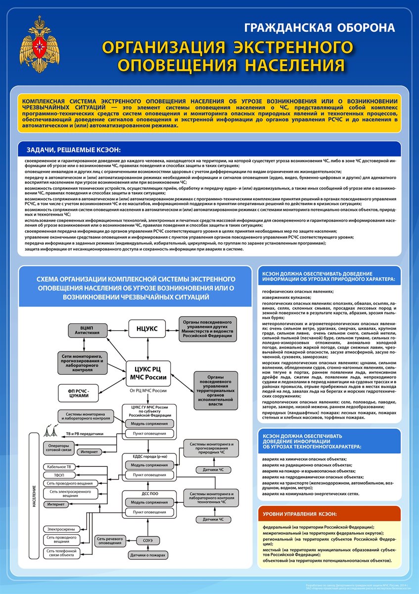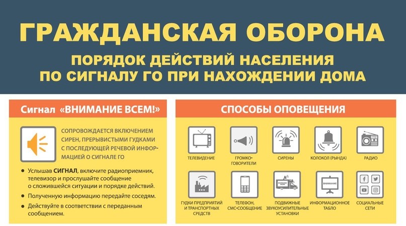 Передача сигналов оповещения и экстренной информации населению осуществляется подачей сигнала «ВНИМАНИЕ ВСЕМ!» путем включения сетей электрических, электронных сирен и мощных акустических систем длительностью до 3 минут с последующей передачей по сетям связи (в том числе сетям связи телерадиовещания, через радиовещательные и телевизионные передающие станции операторов связи и организаций телерадиовещания с перерывом вещательных программ) аудио- и (или) аудиовизуальных сообщений с информированием населения о порядке действий при воздушной тревоге, химической тревоге, радиационной опасности, угрозе катастрофического затопления и других опасностях.