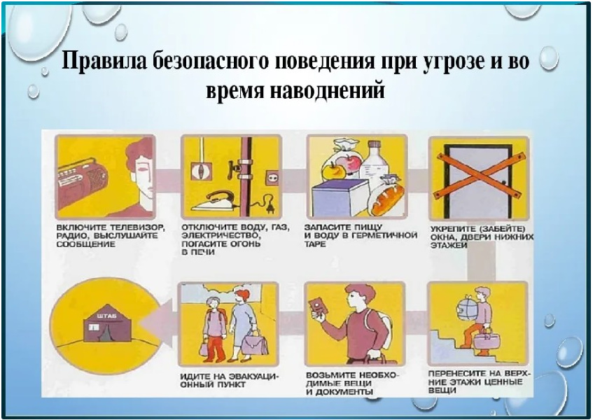 Перед уходом из дома выключите электричество и газ, погасите огонь в отопительных печах, закрепите все плавучие предметы, находящиеся вне зданий, или разместите их в подсобных помещениях. Если позволяет время, ценные домашние вещи переместите на верхние этажи или на чердак жилого дома. Закройте окна и двери, при необходимости и наличии времени забейте снаружи досками (щитами) окна и двери первых этажей. При отсутствии организованной эвакуации, до прибытия помощи или спада воды, находитесь на верхних этажах и крышах зданий, на деревьях или других возвышающихся предметах. При этом постоянно подавайте сигнал бедствия: днем – вывешиванием или размахиванием хорошо видимым полотнищем, подбитым к древку, а в темное время – световым сигналом и периодически голосом. При подходе спасателей спокойно, без паники и суеты, с соблюдением мер предосторожности, переходите в плавательное средство. При этом неукоснительно соблюдайте требования спасателей, не допускайте перегрузки плавсредств. Во время движения не покидайте установленных мест, не садитесь на борта, строго выполняйте требования экипажа. Самостоятельно выбираться из затопленного района рекомендуется только при наличии таких серьезных причин, как необходимость оказания медицинской помощи пострадавшим, продолжающийся подъем уровня воды при угрозе затопления верхних этажей (чердака). При этом необходимо иметь надежное плавательное средство и знать направление движения. В ходе самостоятельного выдвижения не прекращайте подавать сигнал бедствия.