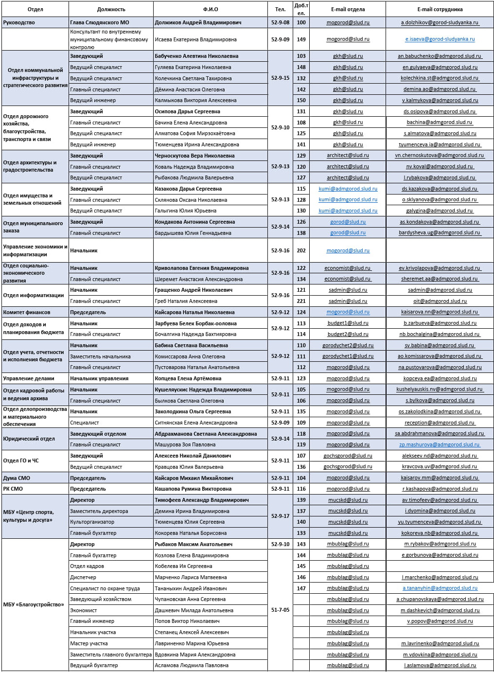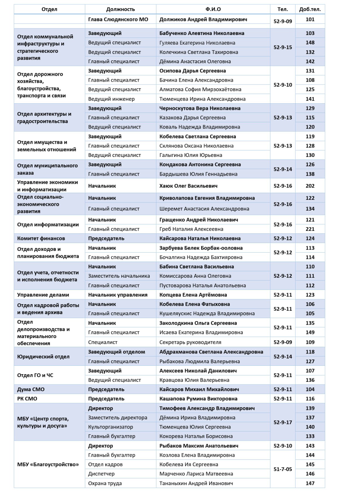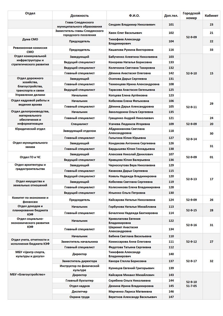 Телефоны сотрудников администрации
